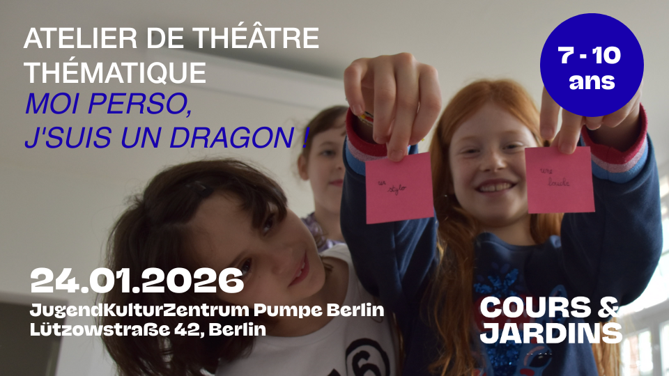 Erkundung des Spiels, der Stimme, der Fantasie, der Improvisation und der Gruppenarbeit. Im Laufe des Jahres entwickeln die Teilnehmer Geschichten, Figuren und bereiten unter der Leitung von Anaïs Caillaud eine Aufführung vor. Abschlussvorstellung im Juni 2026. Anmeldung: https://coursetjardins.org/atelier-de-theatre-en-francais/Anmeldung auch während des Jahres möglich – kontaktieren Sie uns.