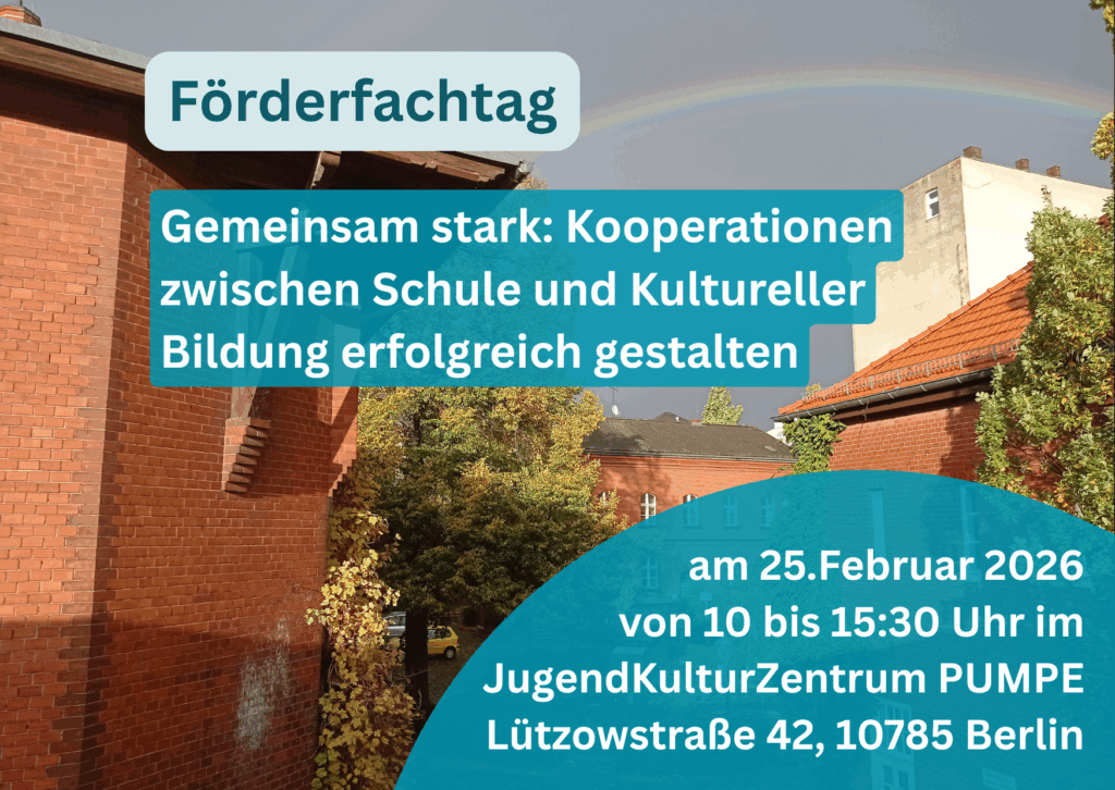 „Gemeinsam stark: Kooperationen zwischen Schule und Kultureller Bildung erfolgreich gestalten“ am 25.02.26, 10 bis 15:30 Uhr im JugendKulturZentrum PUMPE Der InfoPoint Kulturelle Bildung – Berliner Servicestelle für „Kultur macht stark“ lädt ein zum diesjährigen Förderfachtag. Auf dem Programm stehen praxisnahe Impulse zu nachhaltigen Kooperationen aus der Perspektive von Schule und Kulturellem Bildungsakteur, persönliche Beratungsrunden mit […]
